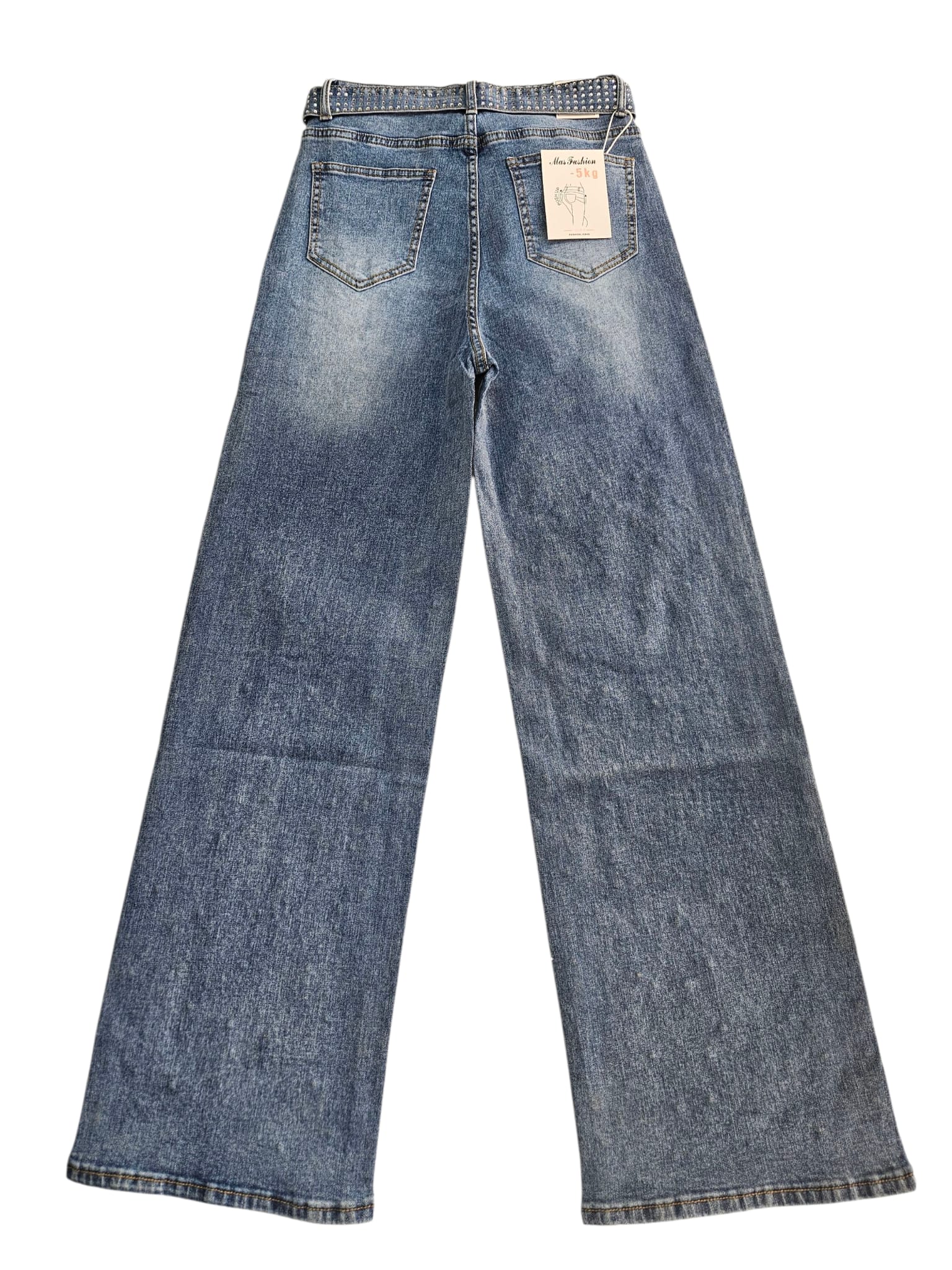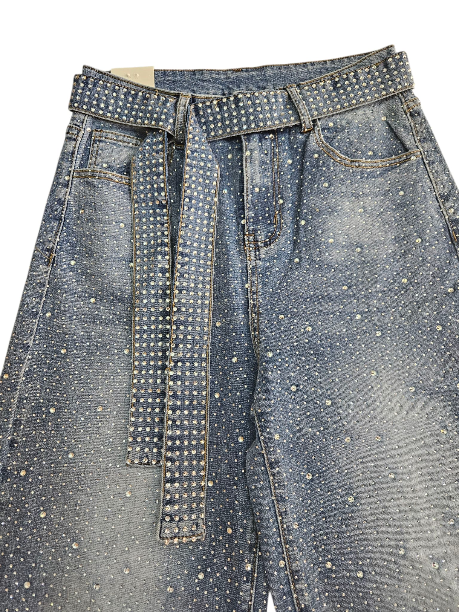 Vaquiero Wide Led con cristales pegados y cinturón, color azul claro, modelo PUSHUP con 98% de algodon y 2% elastano. Tallas S, M, L y XL