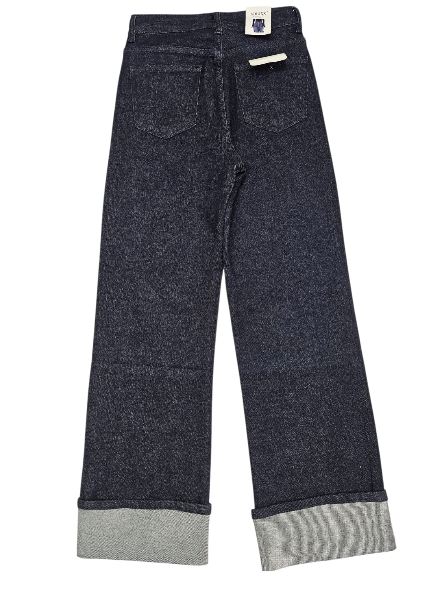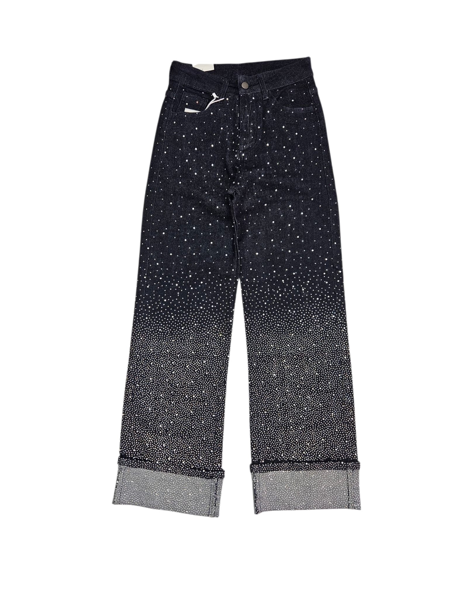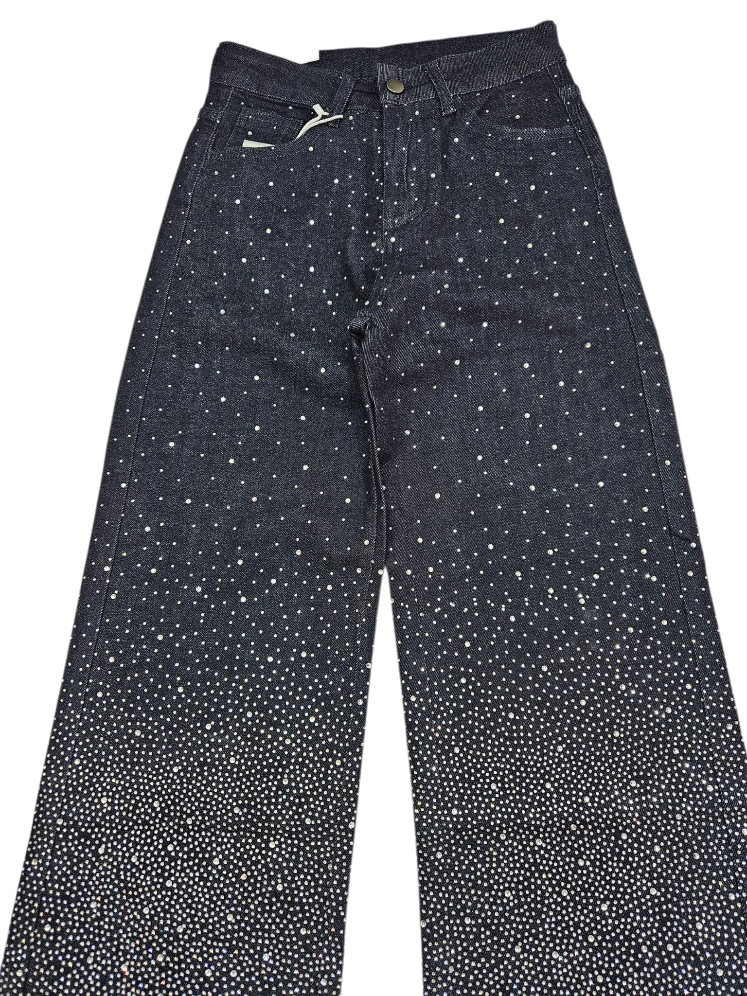 Vaquiero Wide Led con cristales pegados por delante y atrás en forma de gotas de lluvia. Color azul vaquiero lavado, material 79% de algodón, 29% tancel y 1 % elastano. Tallas XS, S, M y L