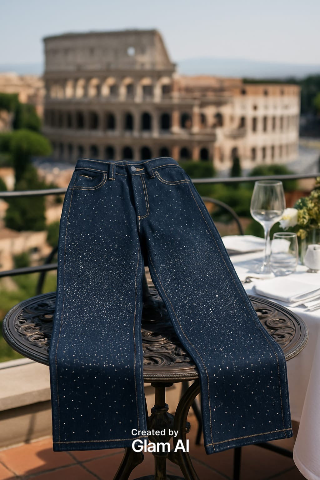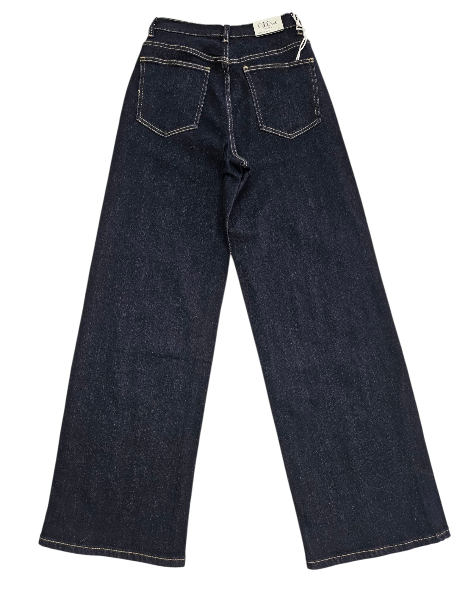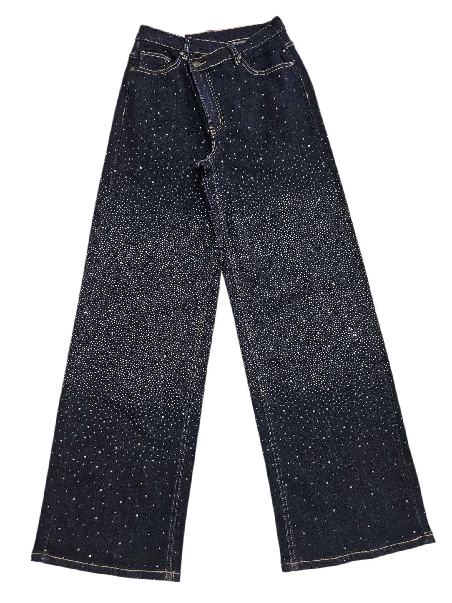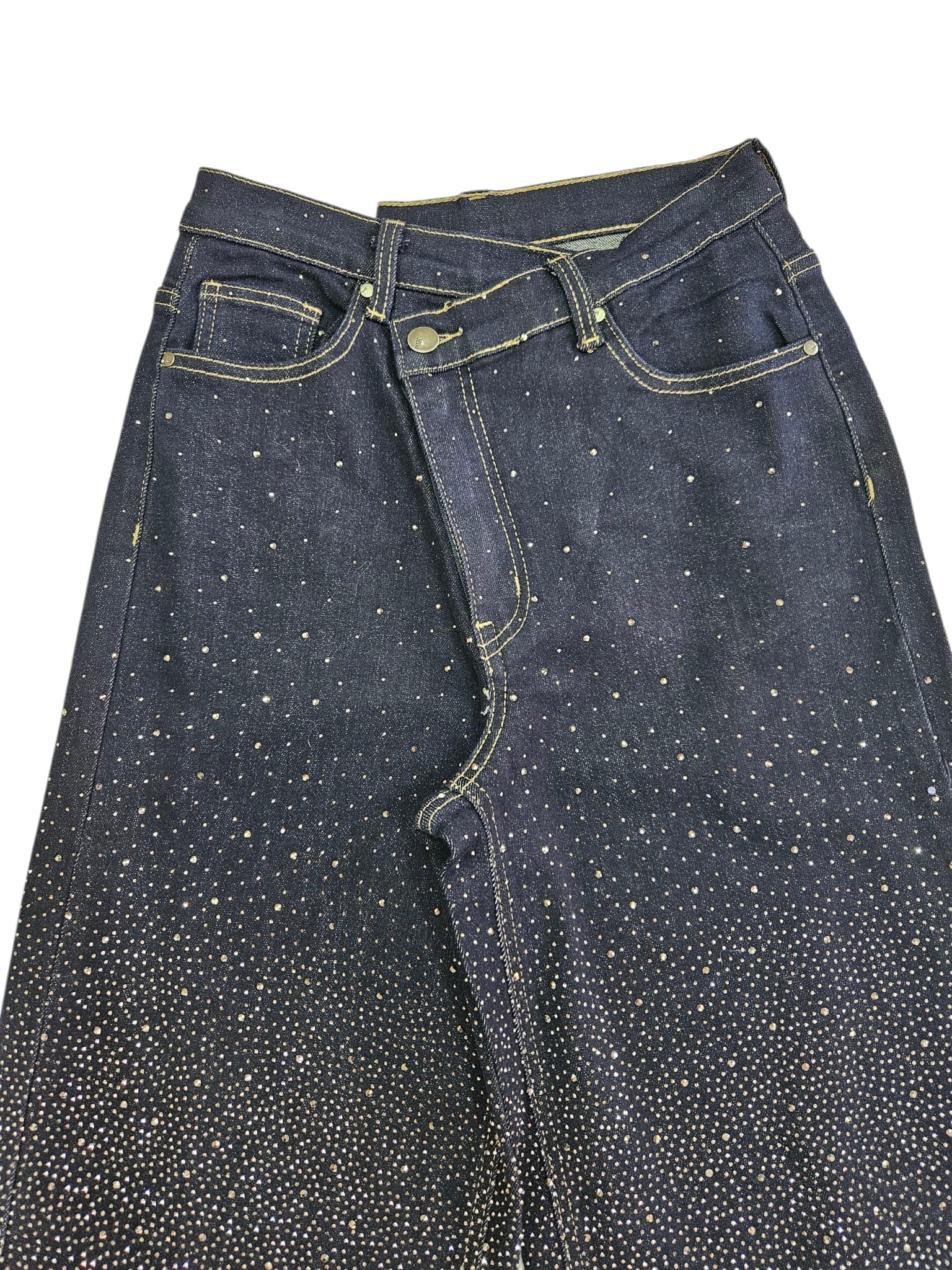 Vaquiero Wide Led con cristales pegados y cierre de cremallera al bies. Color azul oscuro con 72% de algodón, 25% de poliester, 2% de viscosa y 1 % de elastan. Tallas XS hasta XL.